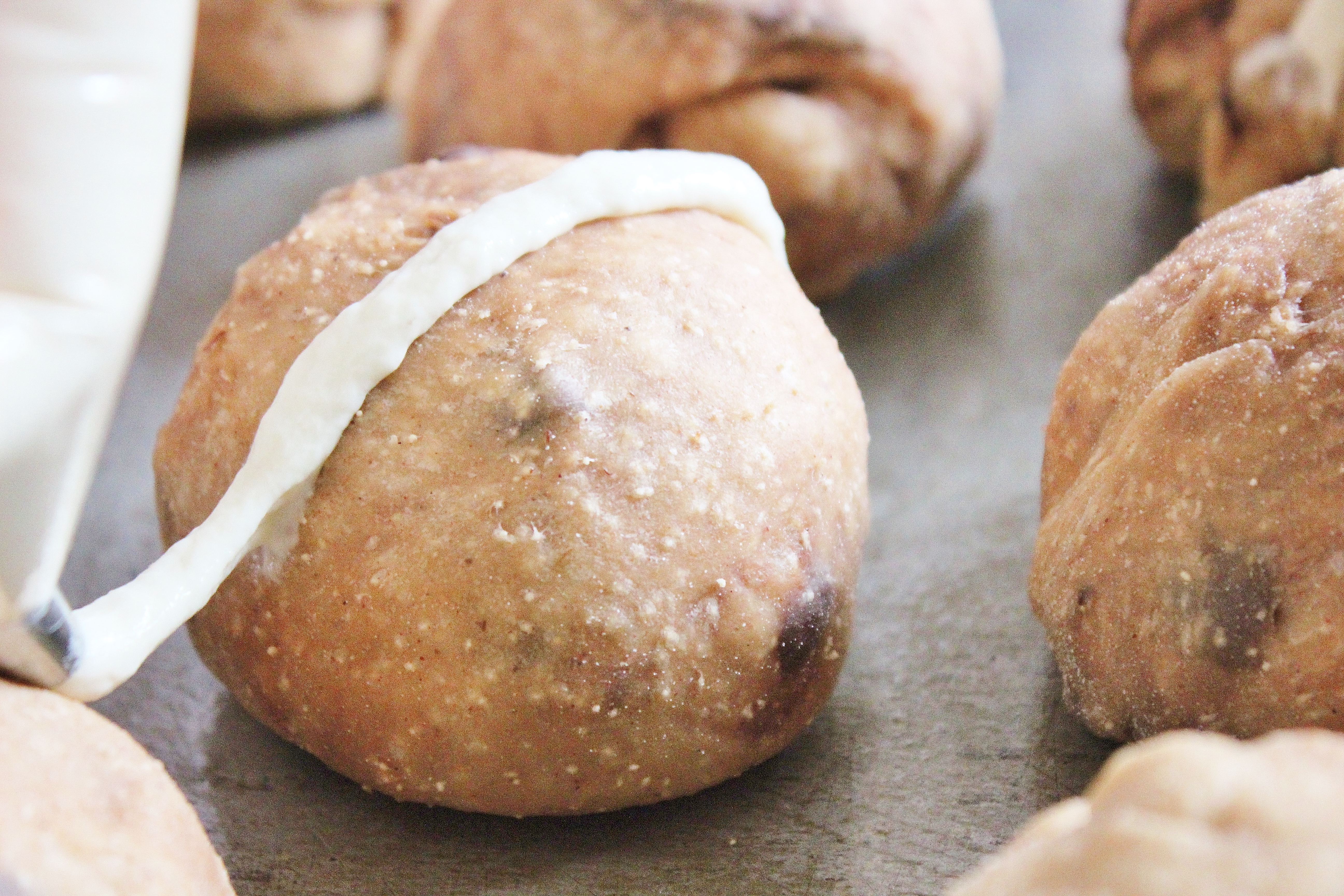 Grab your risen dough and huddle them closer in together, so that they’re just touching. Pipe the crosses over them.