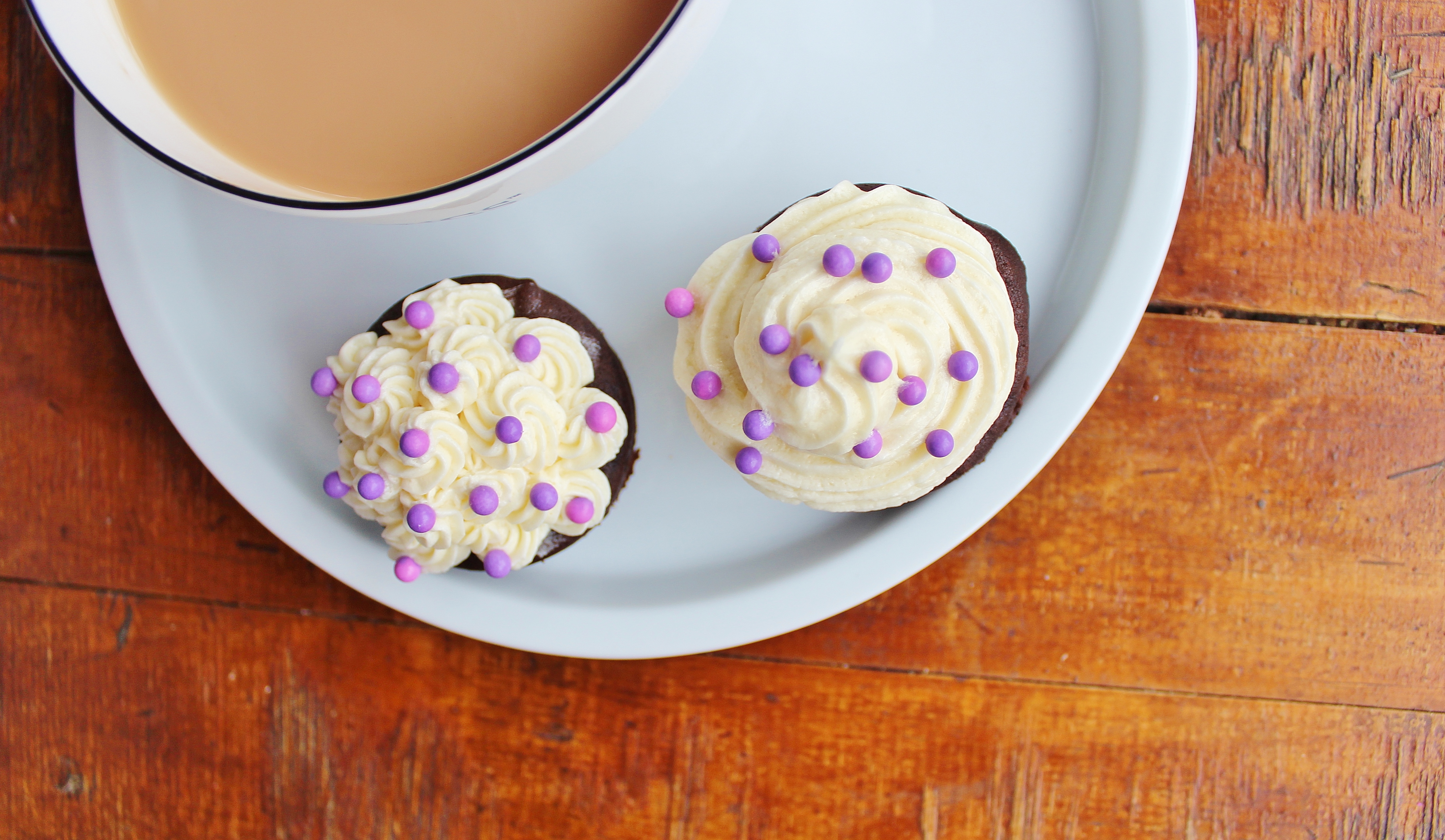 Cream together the Nuttelex, sugar and vanilla. Add in the flour and milk, followed by the cocoa and cornflour. Pour the apple cider vinegar and bicarb and mix them in. Scoop about two tablespoons of batter into each cup and pop in the oven for 18-20 minutes. You’ll know they’re ready when they spring back slightly when pressed gently in the centre of the cupcake. Set to one side to cool.