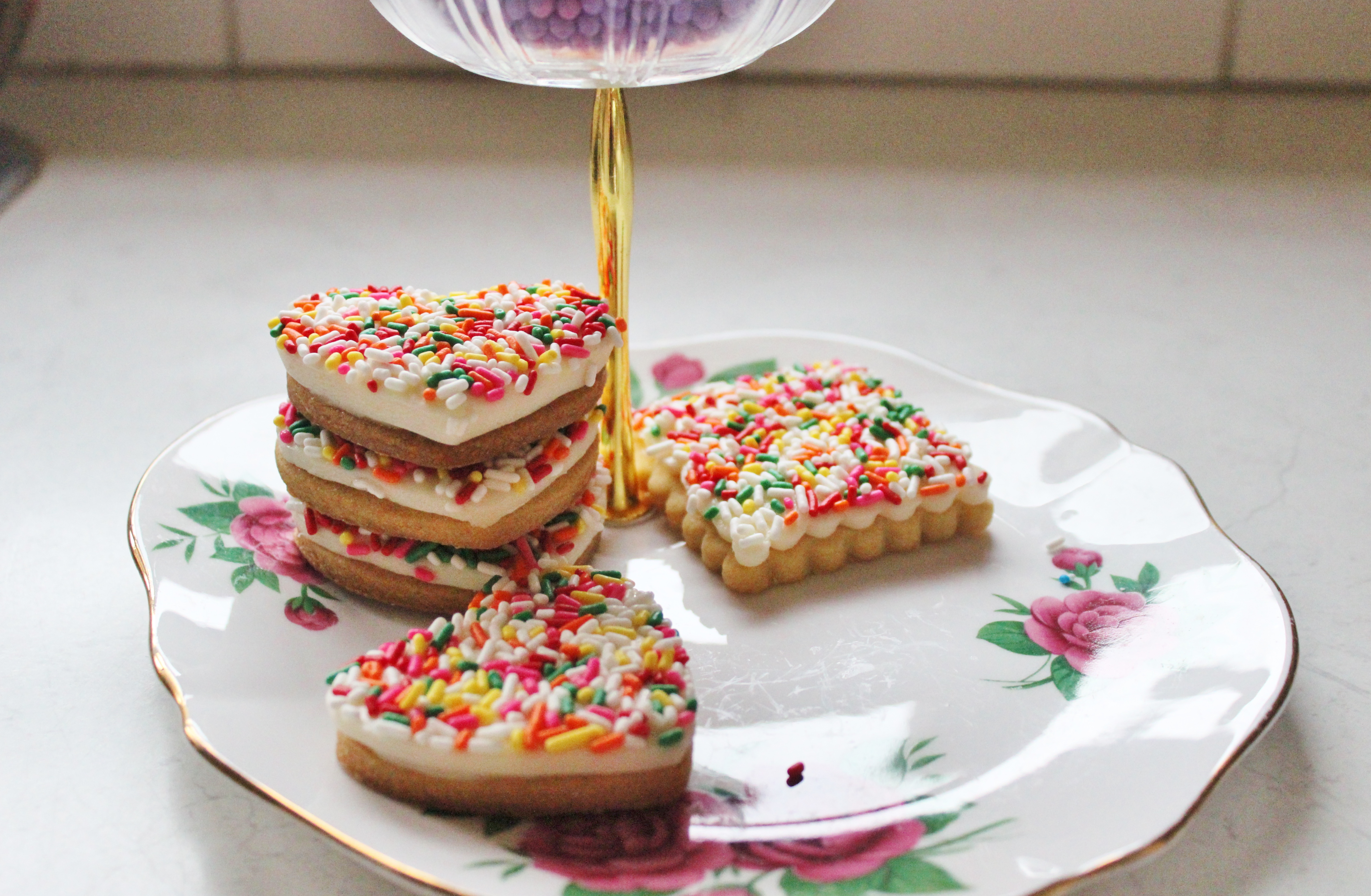 You can decorate your freshly fondanted biscuits any way you want – I opted for sprinkles. To do this, grab a pastry brush and a small amount of water, then pour your sprinkles into a small dish that you can dip your biscuits into. Brush your fondant with a small amount of water (making sure you cover all the way to the edges) and then press the fondant into the sprinkles, then repeat with the remaining biscuits.