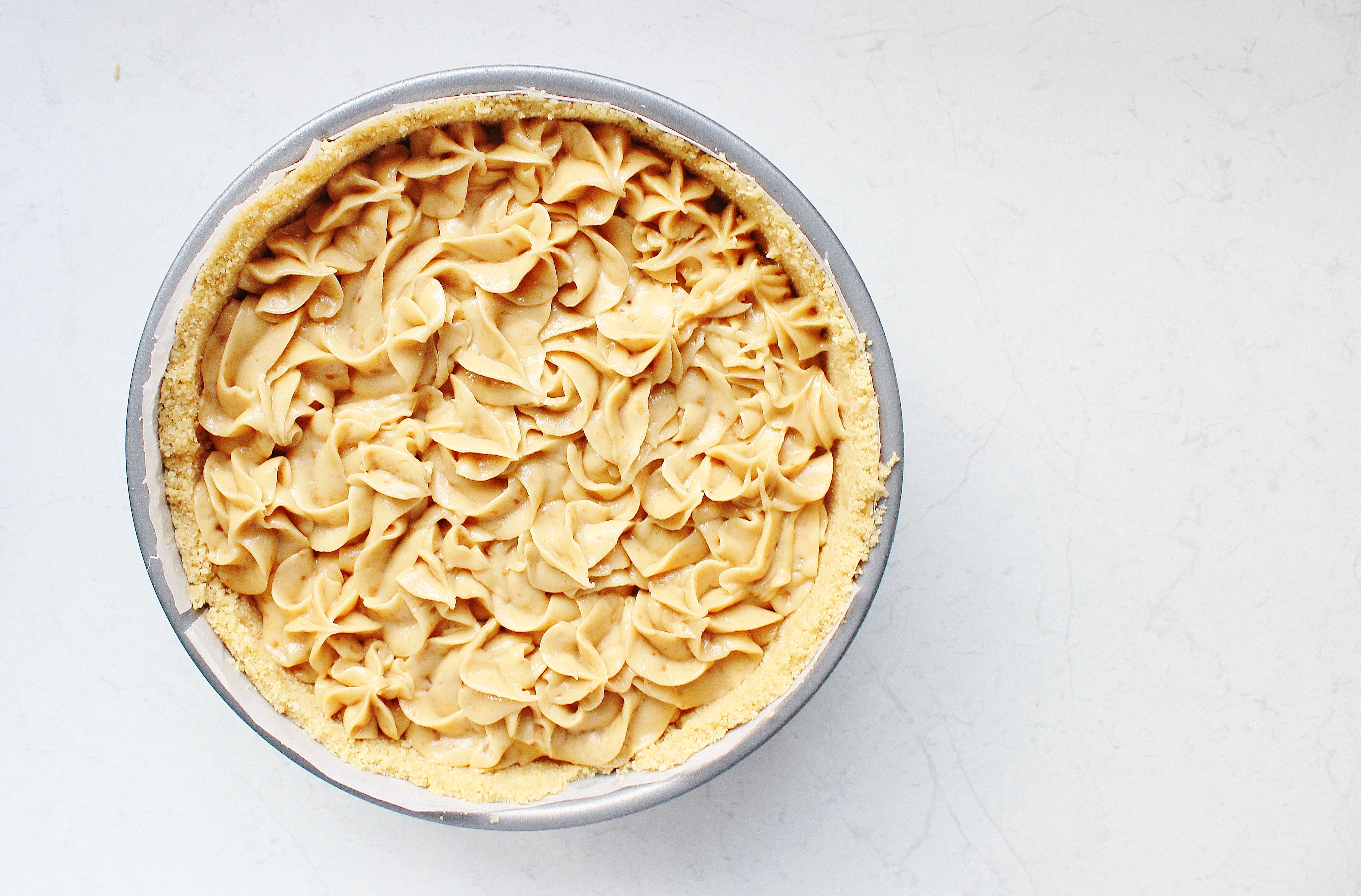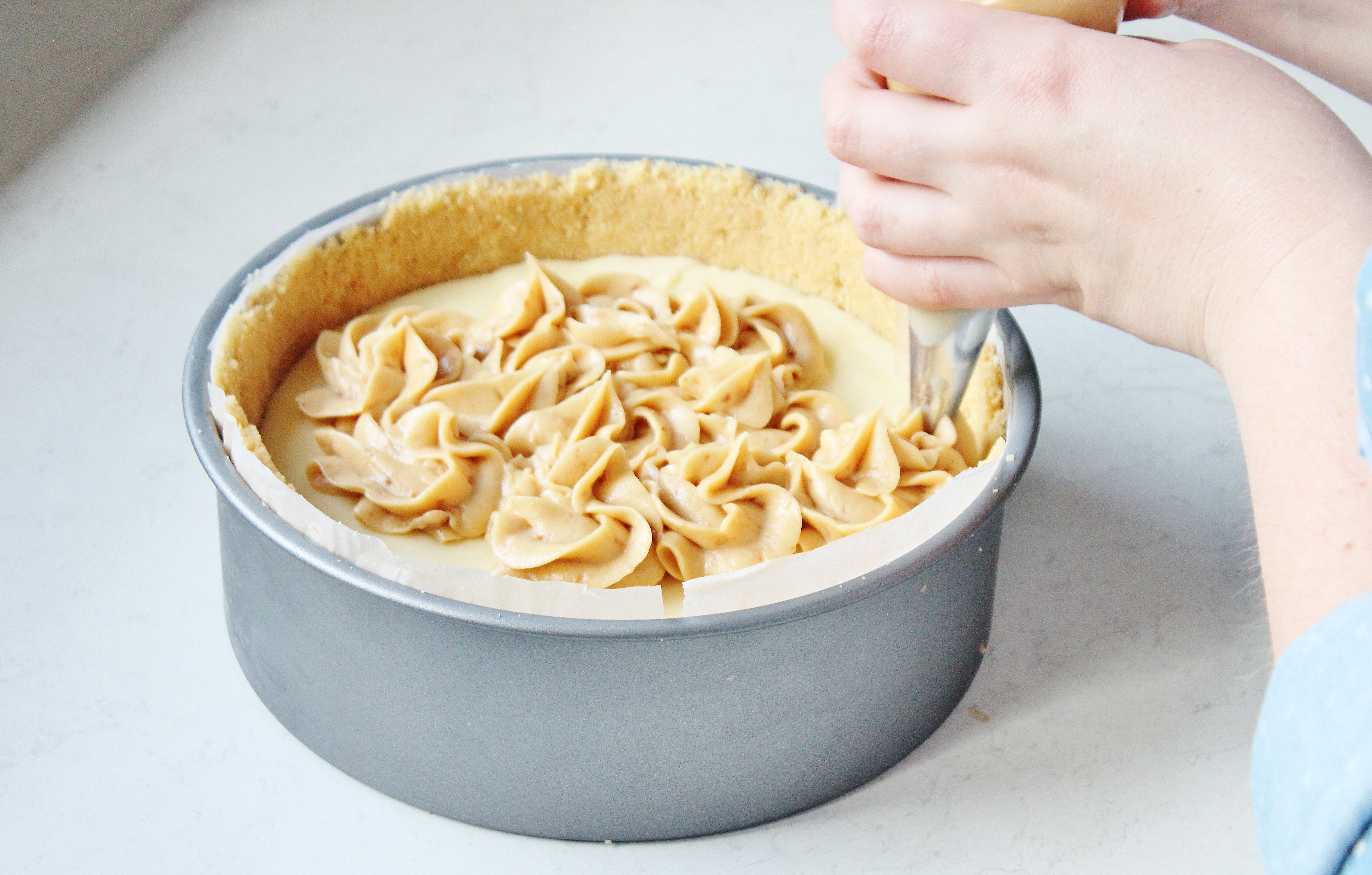 Remove the base from the fridge and spread the peanut butter evenly over the base. Pour the white filling over the top and pop into the fridge for at least 2 hours.