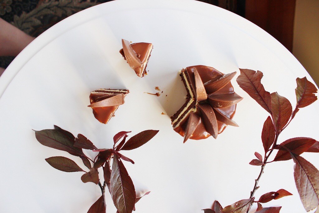 To make the ganache, pop a glass container over a pot of boiling water and pour the cream into the glass container. Allow the cream to come to body temperature and pop the chocolate in, stirring it for 30 seconds. Turn the heat off and continue to stir the chocolate until it is melted and combined with the cream. Stand at room temperature until the mixture thickens, then spoon over the cakes. Pop in the fridge for 30 minutes to set.