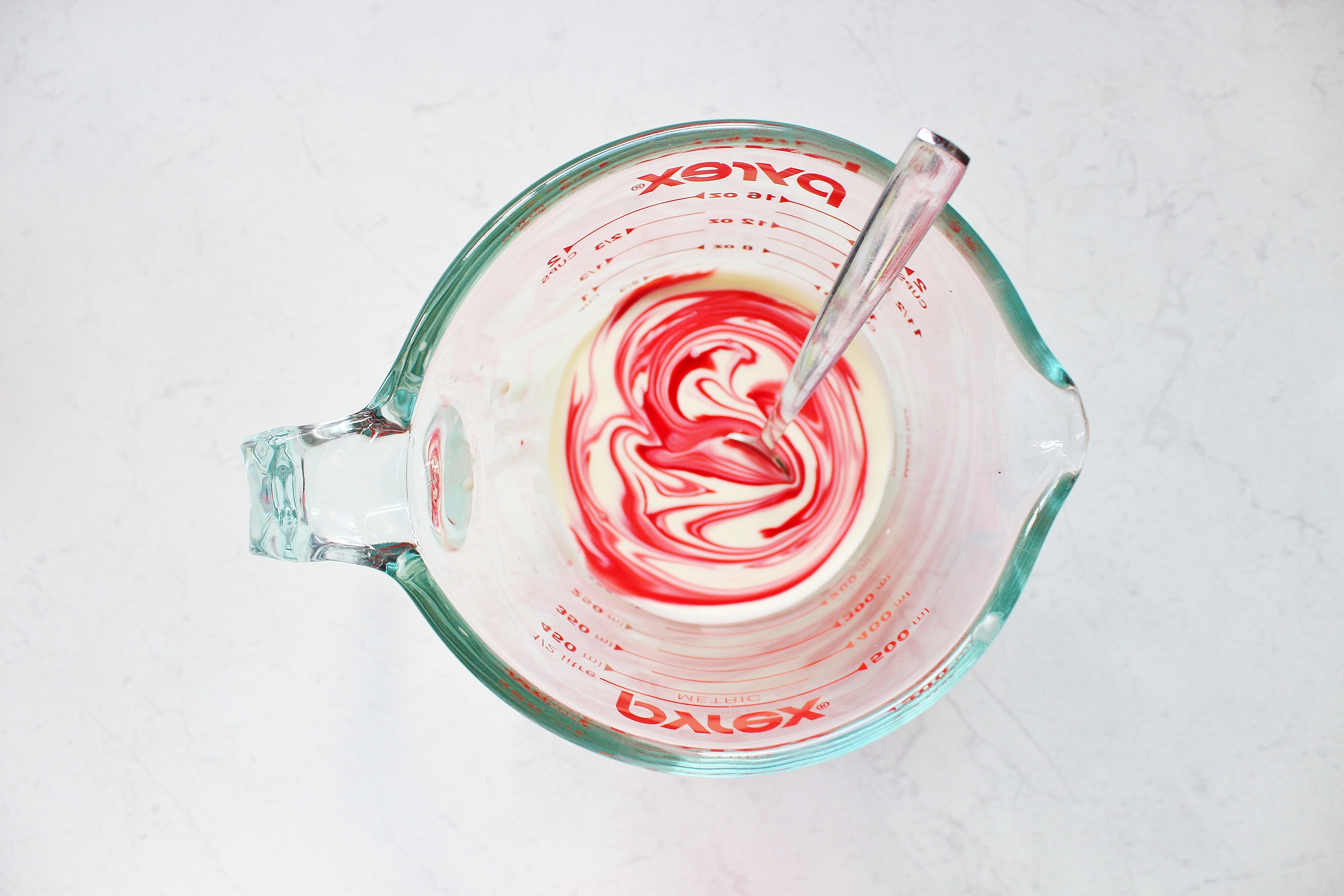 Mix your red food colouring into your cream so that you have a vibrant red. Depending on the food colouring you’re using, this could take 3 drops, or 3 teaspoons – play around with it until you’re happy. Mix well.