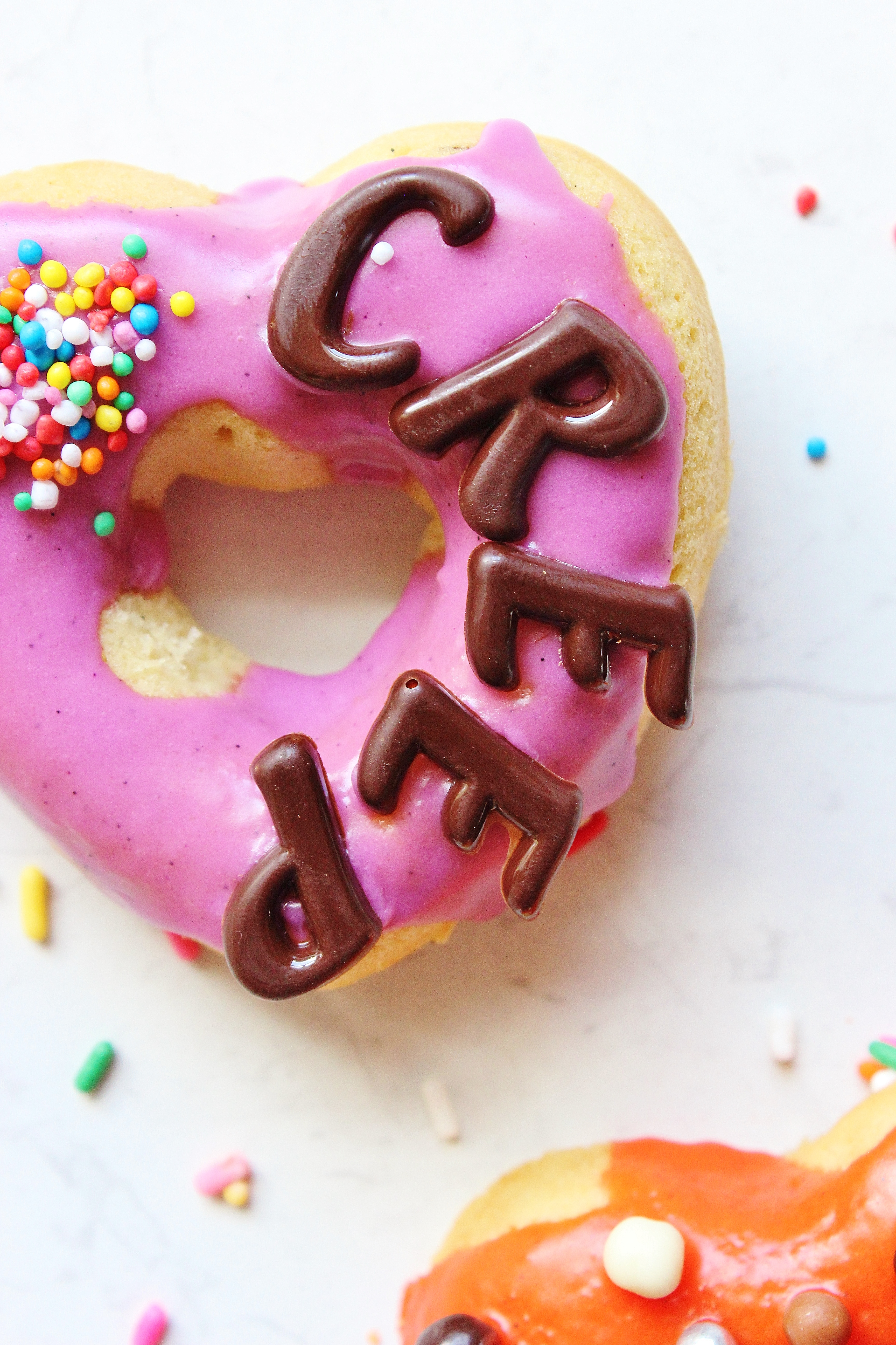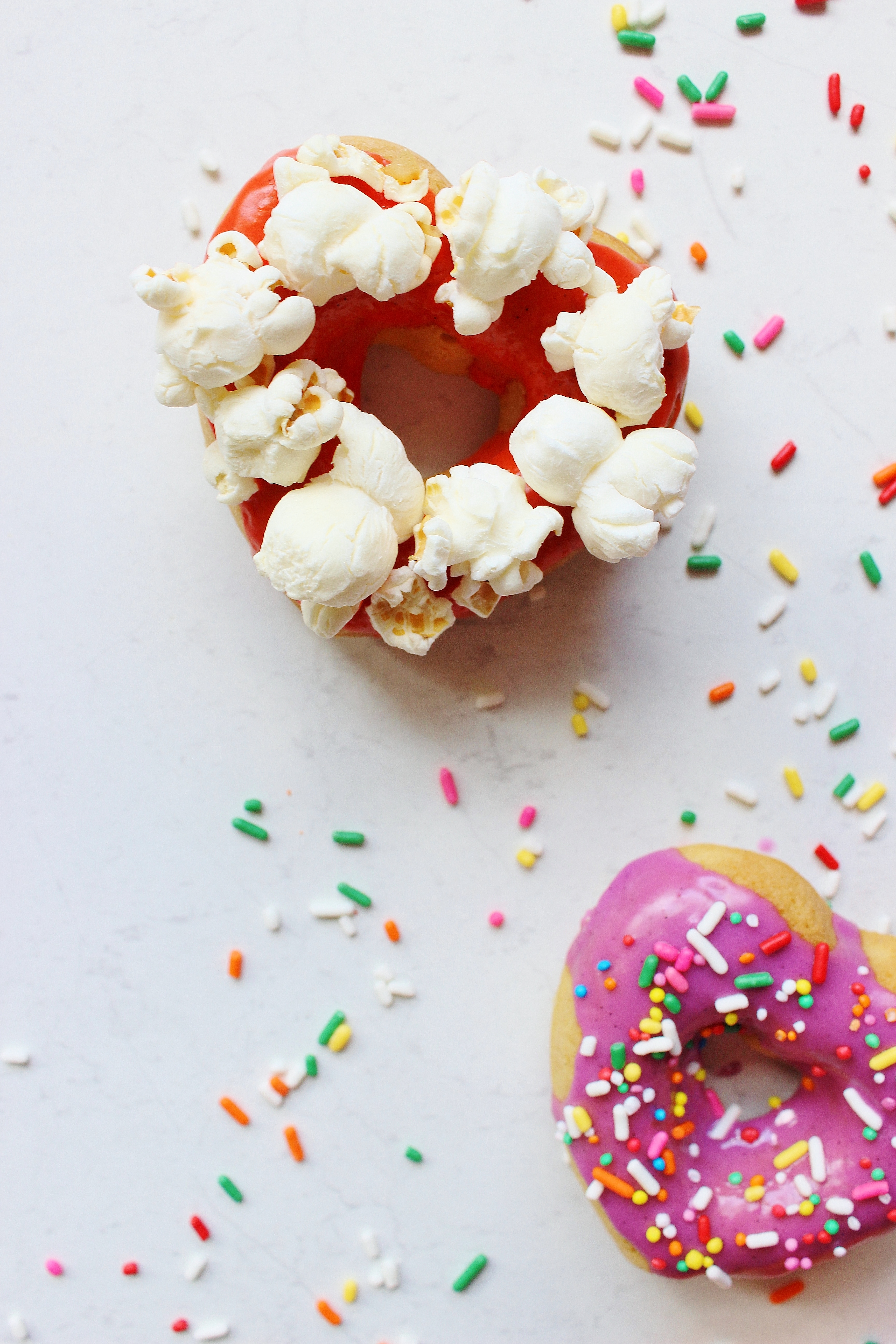 While the doughnuts are cooling, make a start on your icing. Mix your vanilla bean paste into your sifted icing sugar as best you can. Add the milk, one tablespoon at a time, until it’s a nice consistency – the mixture should be runny enough that it will spread, but isn’t thin. Divide your icing between two bowls and add food colouring to each one, mixing thoroughly afterwards. I used Americolor soft gel paste colouring, which is really highly concentrated. If you’re using regular food colouring, you may need a few extra drops to achieve the same vibrancy – take it steady when adding the colouring and use your best judgement to see whether you need more.