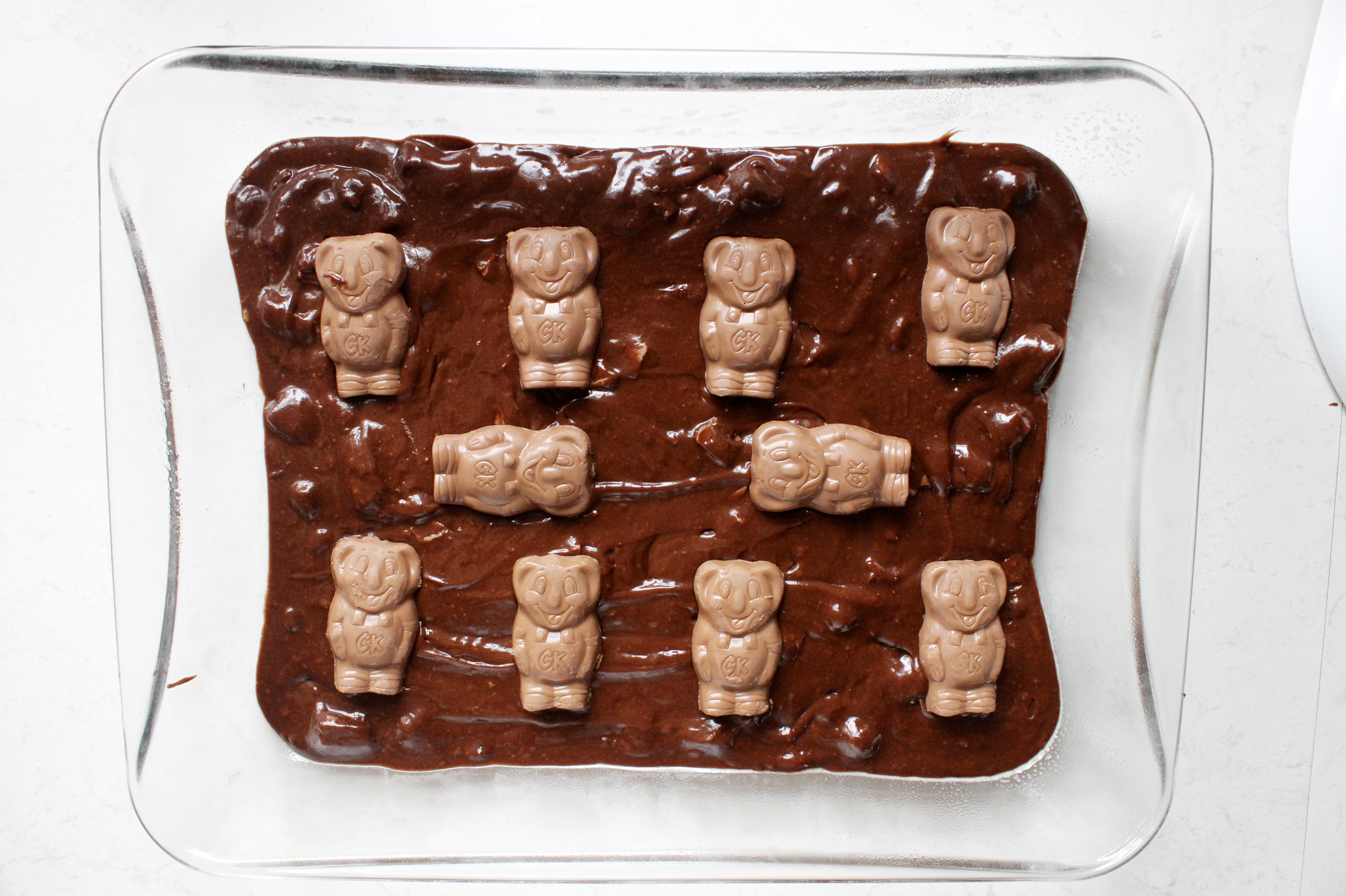 Scoop half of your mixture into the baking tin and spread evenly. Unwrap all of your Caramellos and place them evenly along your mixture. I opted for a formation like this (I know, this photo doesn’t have all 16 in it!), but you can distribute them as you please.