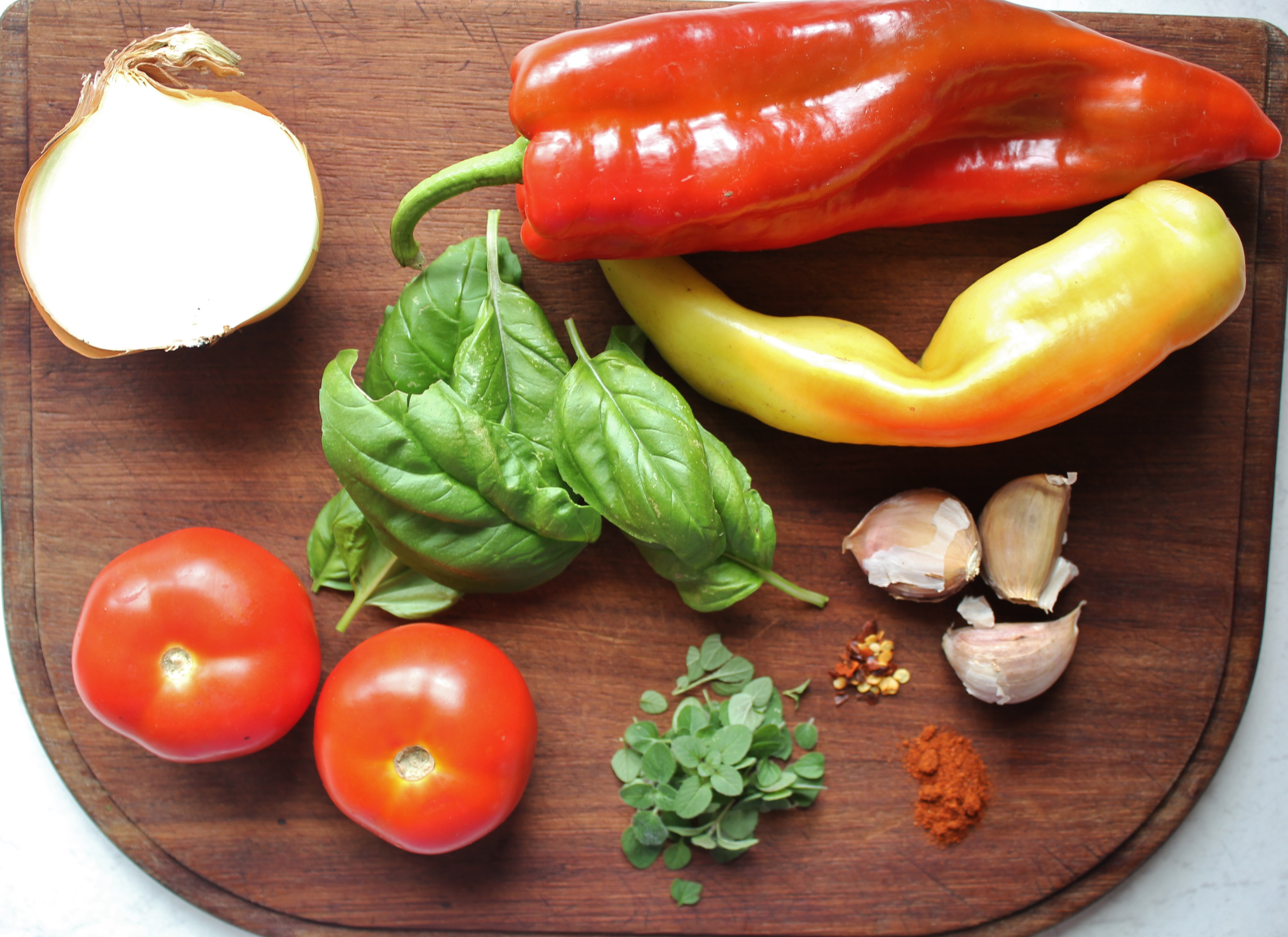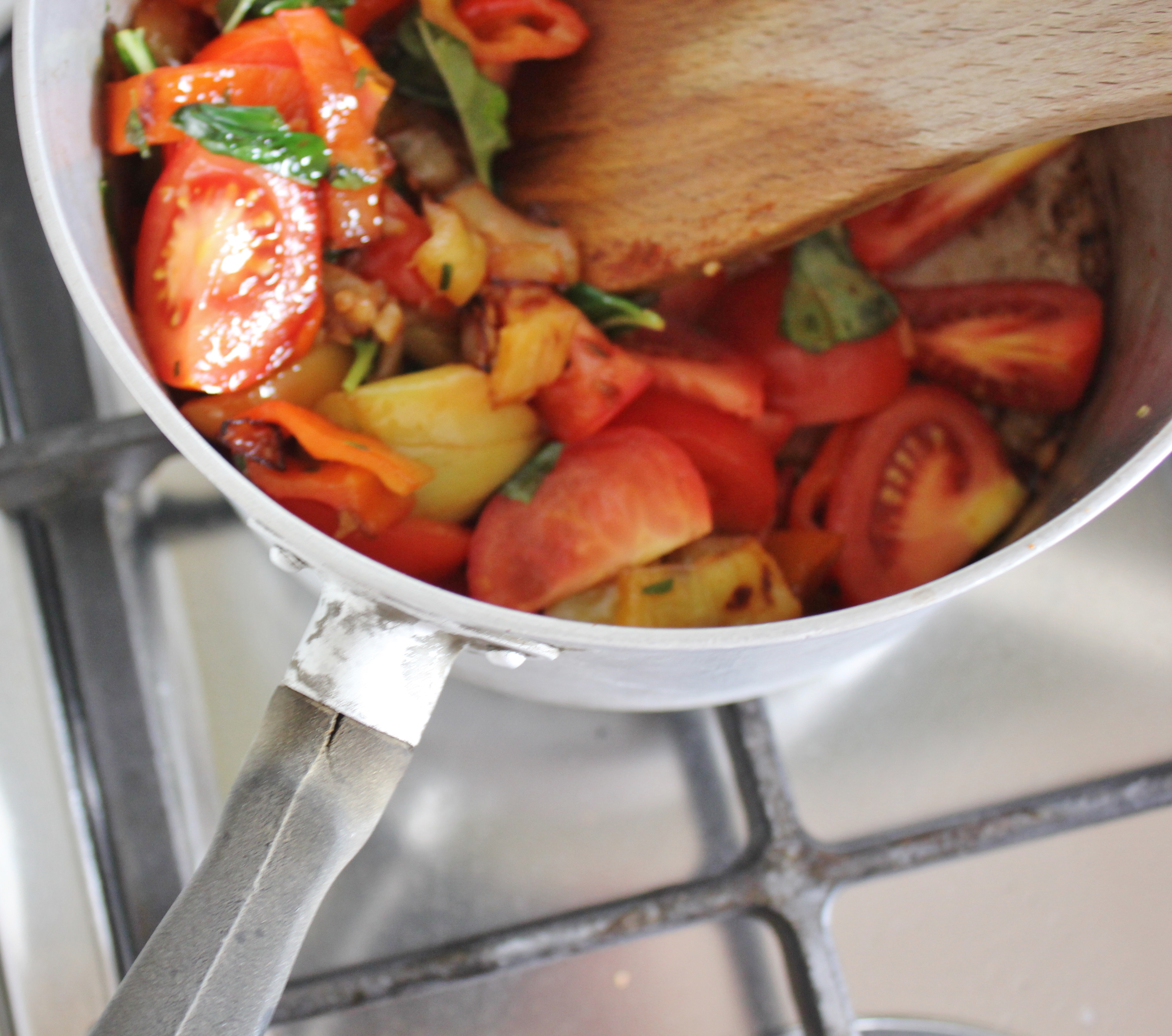 coloursAdd in all the remaining ingredients – the paprika, chili flakes, tomatoes,  basil and oregano – and give it a good mix. Turn the heat down to low and let the mixture reduce away for 15 minutes.