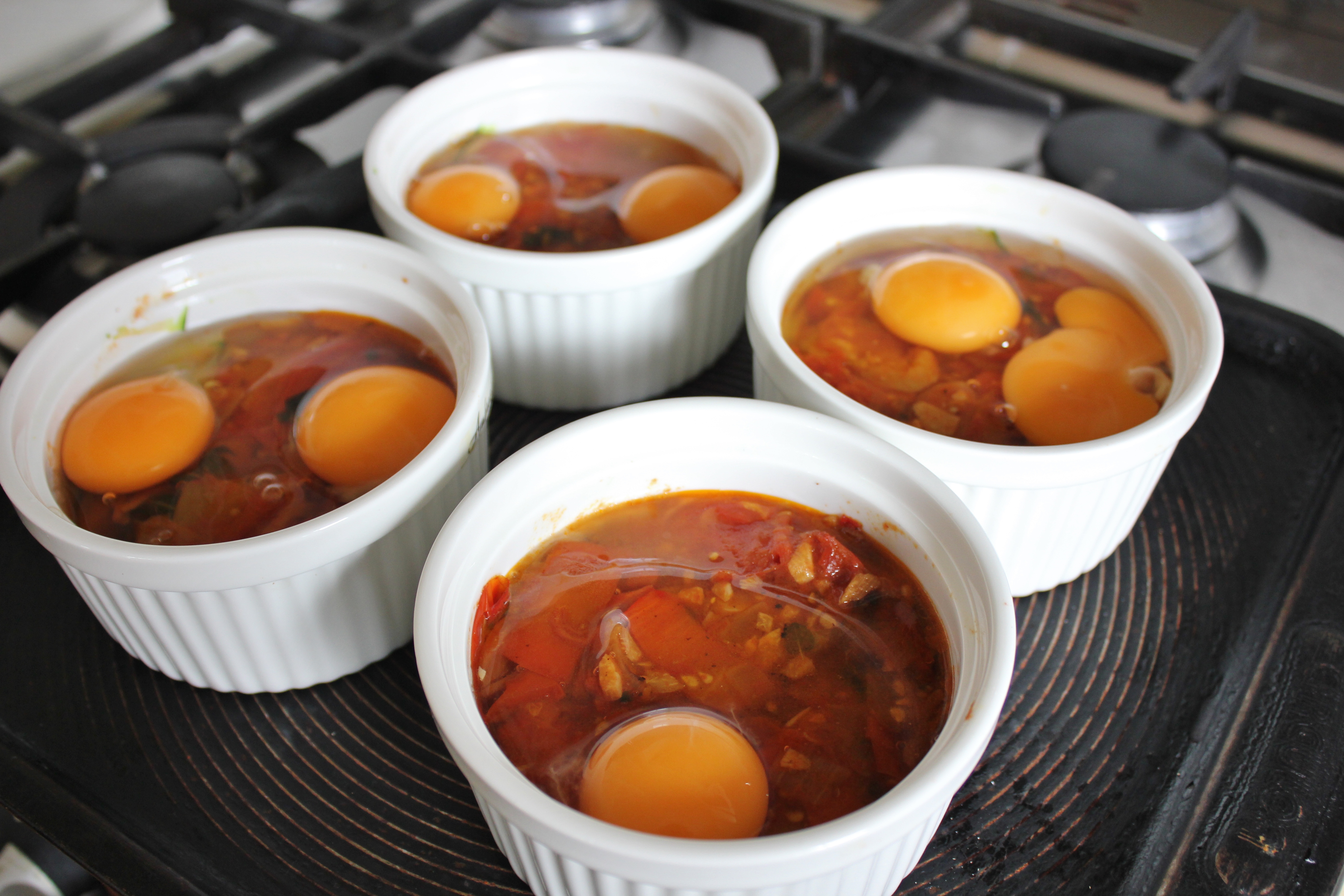 spoonPour the hot tomato mixture straight over the zucchini in the ribbons, distributing it evenly amongst the ramekins. Give the ramekins a shake to spread the mixture out evenly. Crack your eggs straight into the ramekins and pop them into oven for 20-23 minutes.