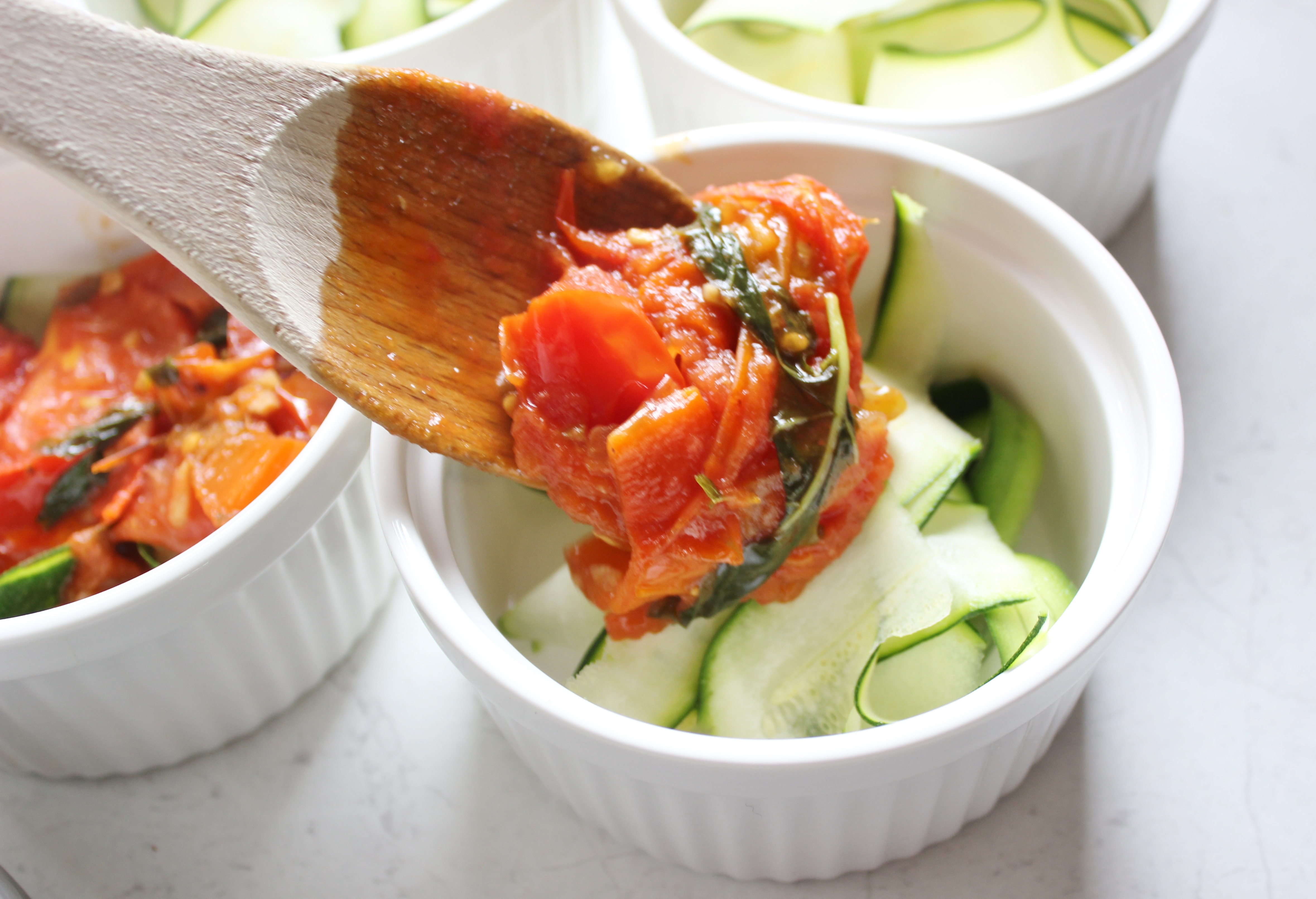 ribbonsWhile the tomato mixture bubbles away, use a vegetable peeler to create ribbons of zucchini. Peel right over your ramekins so that the ribbons fall unevenly into the ramekins.
