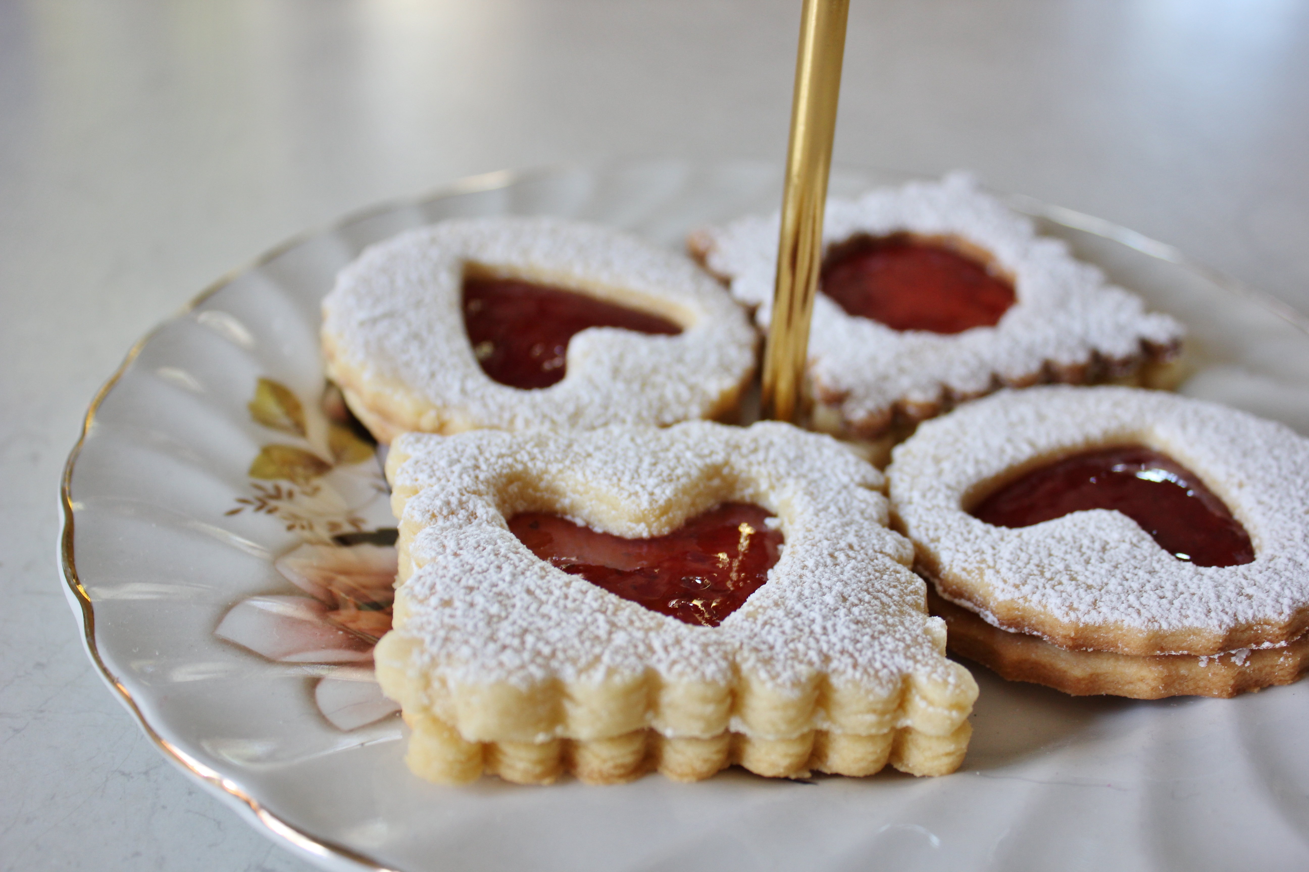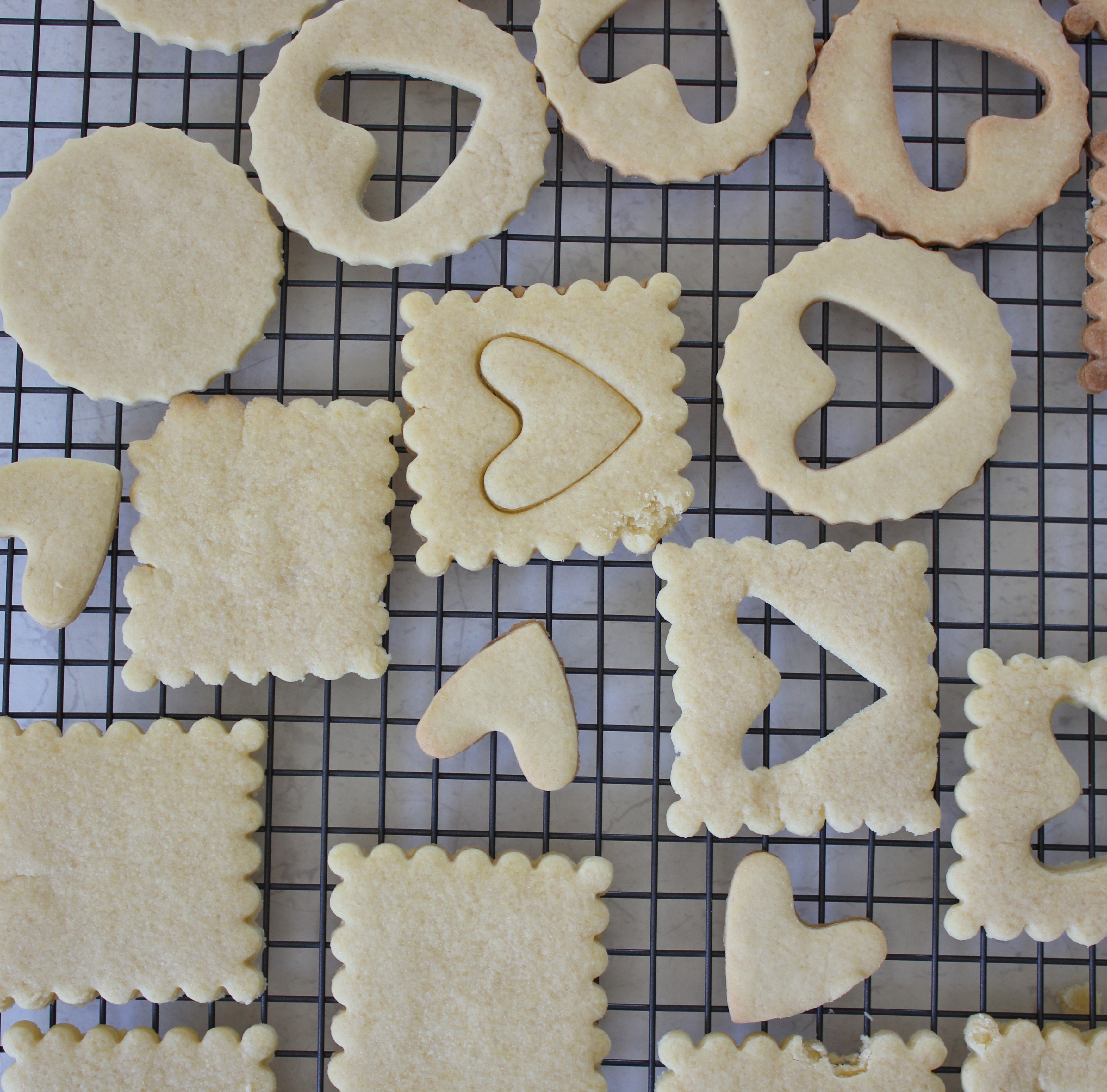 Now take a second, smaller shape cutter (I chose a love heart, but you can use any shape) and press it into the centre of half of the biscuits. Re-roll dough and repeat. At the end of the process you should have about 24 individual biscuits, which will make 12 sandwiches. I kept the mini hearts that came out of the centre of the biscuits and topped them with plain icing and sprinkles – they were a good addition to my high tea selection!