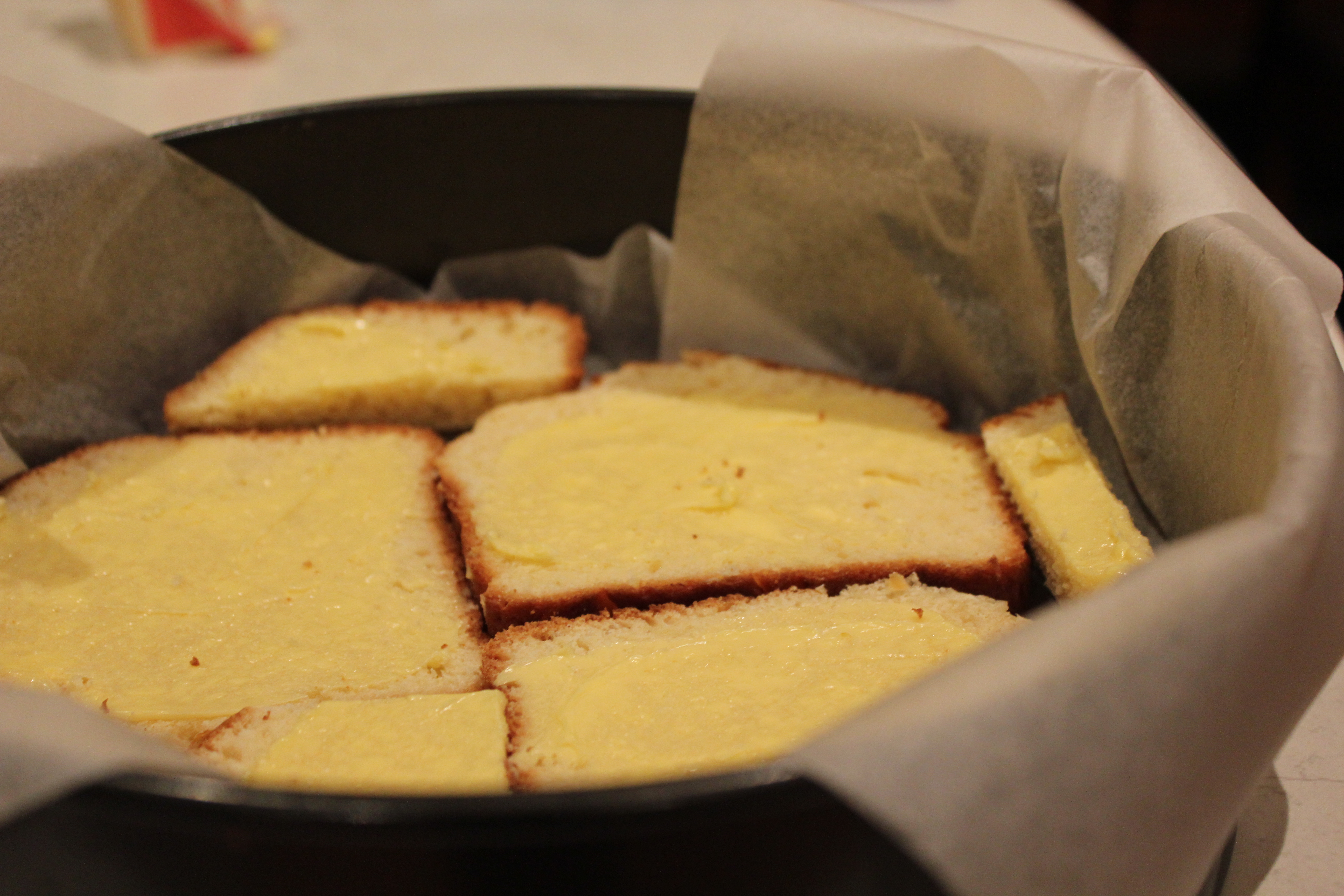 eggsCombine the vanilla, sugar, cream and milk and set to one side. Take your apples off the heat and allow them to cool. Slice up your brioche and butter the pieces liberally. Cover the outside of a 23cm tin with foil to prevent leakage – if you skip this step the egg mixture will seep out and burn the bottom of your oven! Line the foiled tin with baking paper.brioche