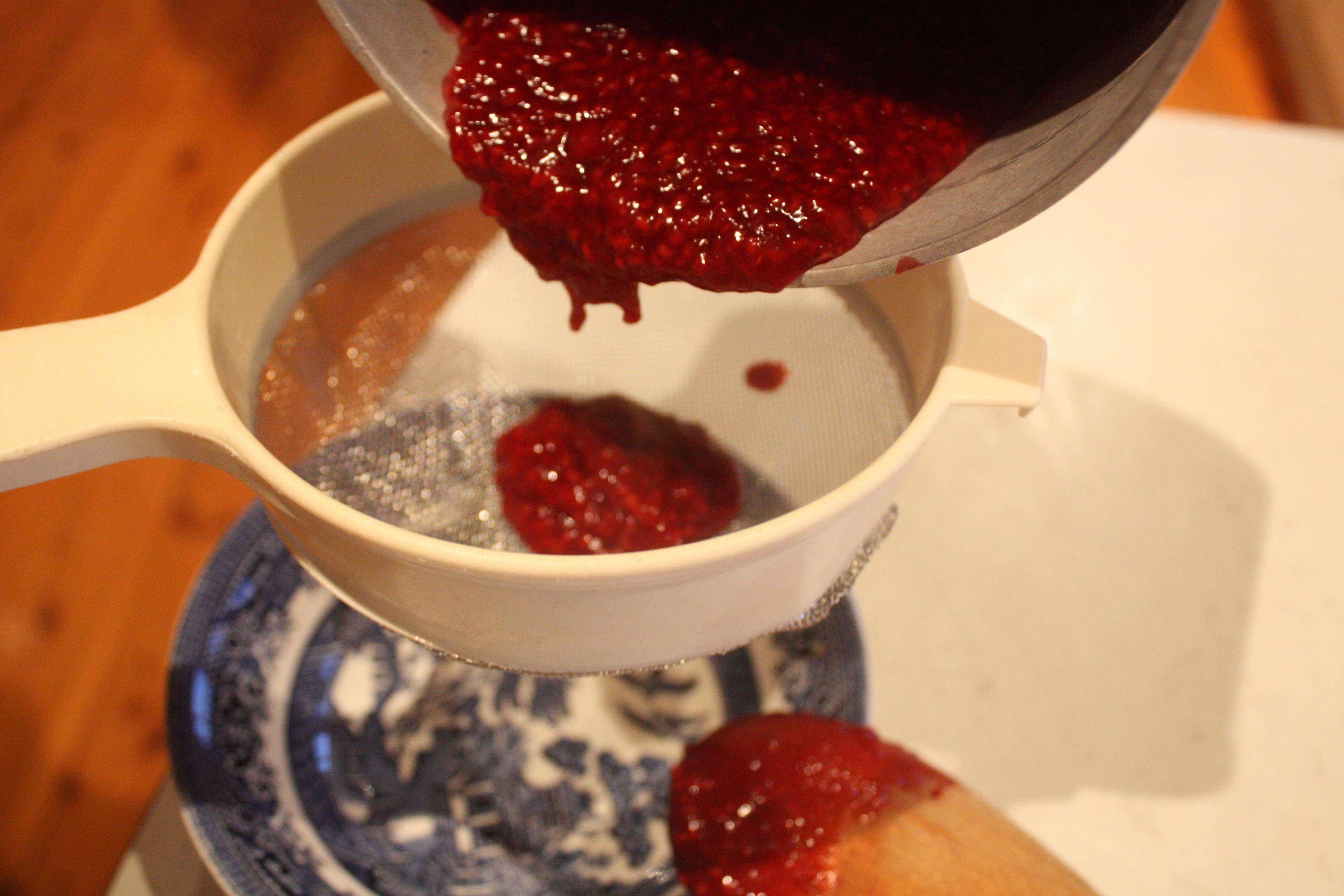 strainPut your frozen raspberries in a small saucepan over a medium heat and sprinkle the sugar in. When the raspberries start to defrost, add the cornflour and water. Stir it often so that it doesn’t stick to the bottom of the pan and burn. When the raspberries have broken down fully, allow the mixture to come to a boil and thicken for about two minutes. Remove your puree from the heat and put it through a strainer to get rid of all the seeds.strained