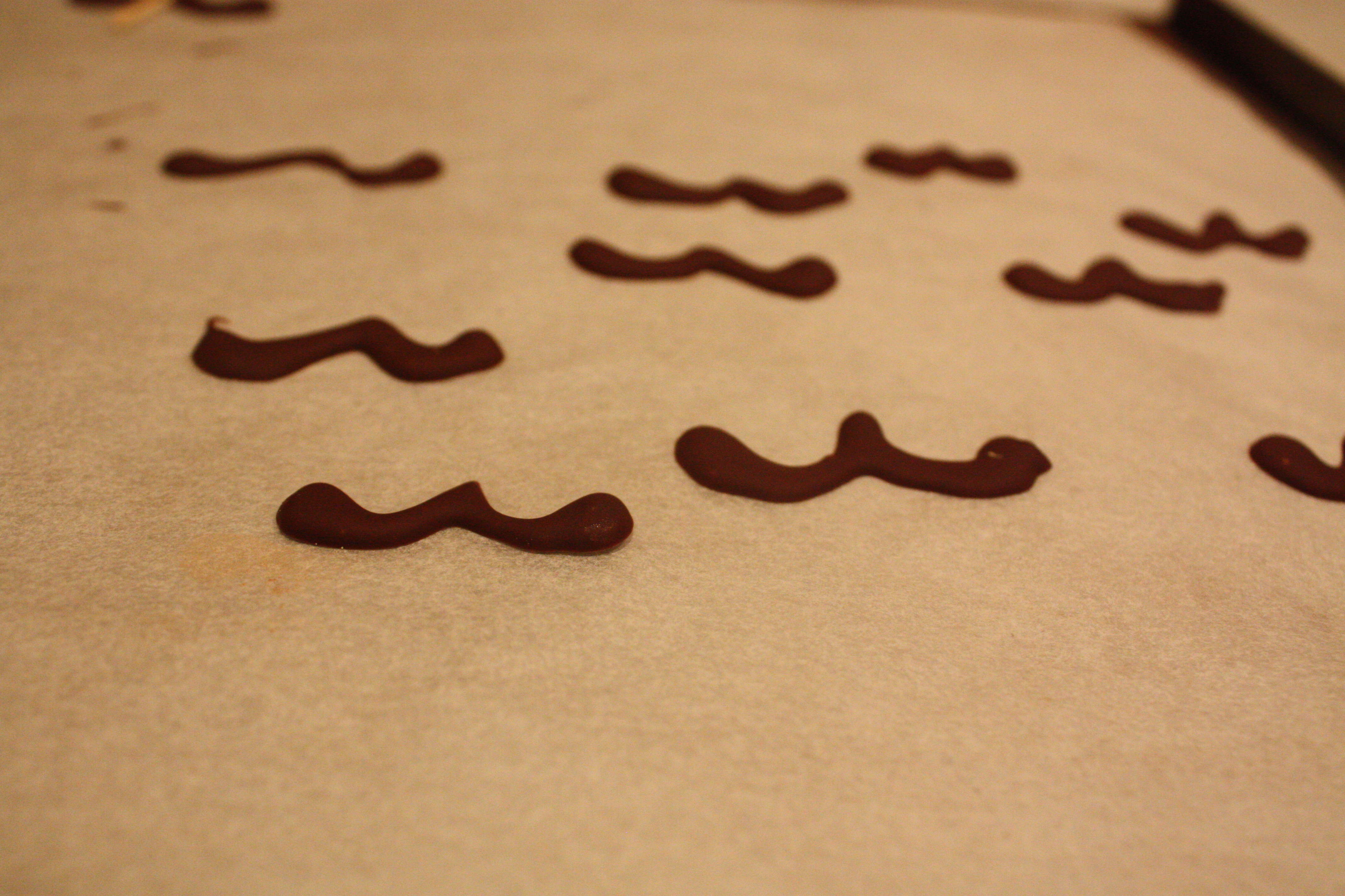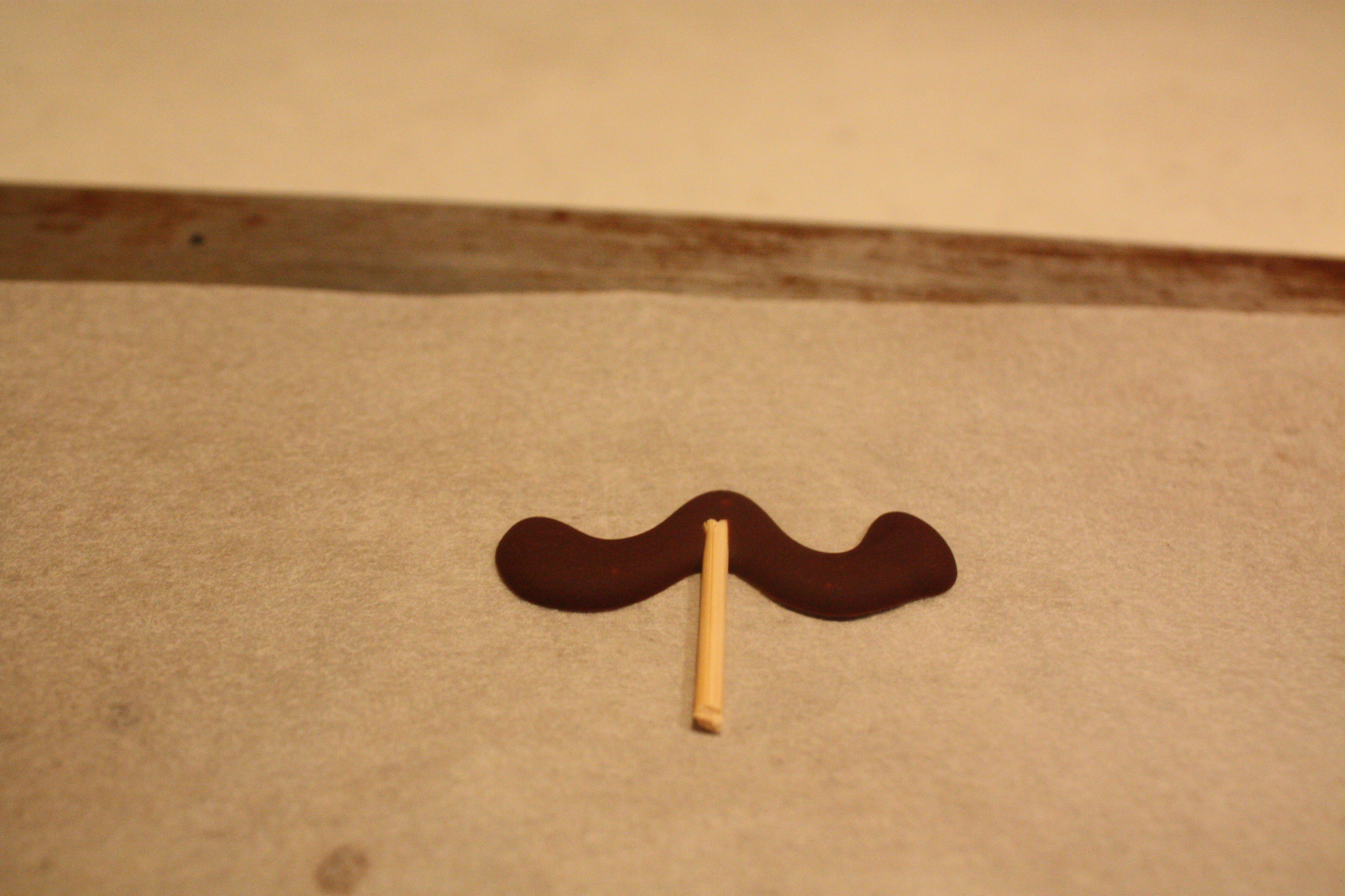 pipedBreak up your chocolate pieces and pop them in the microwave until they’re melted. Stir it every 20 seconds or so to avoid burning it. Once it’s all glossy and melted, scoop it into your piping bag and pipe loose ‘m’ shapes onto the baking paper for the moustache. For the tophats, start with a line, then pipe a square on top of it. It’s easiest if you work quickly – the chocolate will be running out of the piping bag quickly, so try to beat it! Don’t worry if it’s a bit messy, you can always eat the reject ones, or melt them down and try again. Once you’ve filled your tray with moustaches and tophats that you’re sufficiently proud of, pop the skewer pieces into the centre of the chocolate. Don’t let them go in wonky or you’ll end up with wonky decorations.