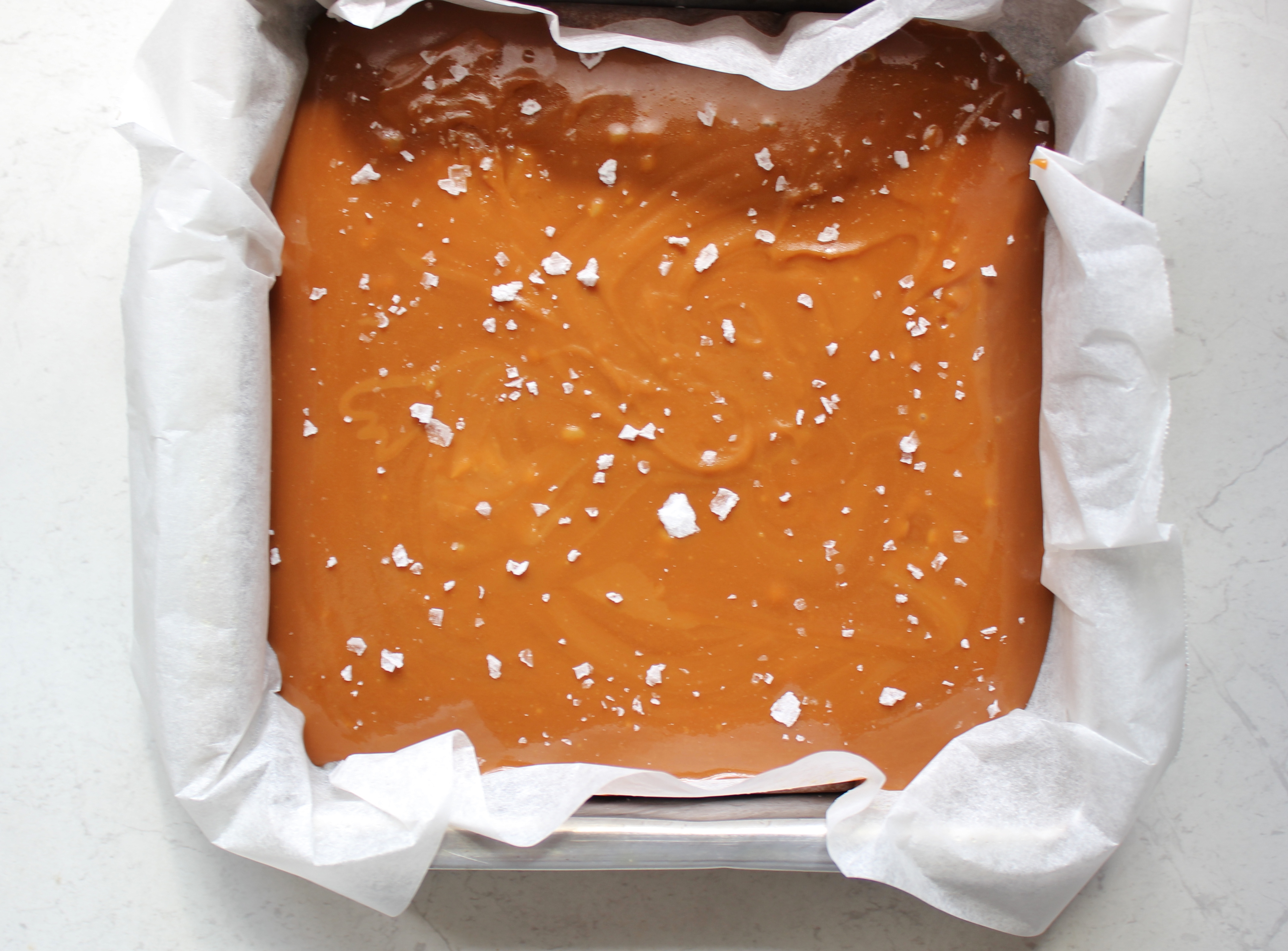 Pour into your prepared pan and allow to cool briefly before putting in the freezer for at least an hour. Be careful, because your tin will heat up because the caramel is so hot. If you want salted caramel, take a pinch or two of salt flakes and sprinkle liberally.