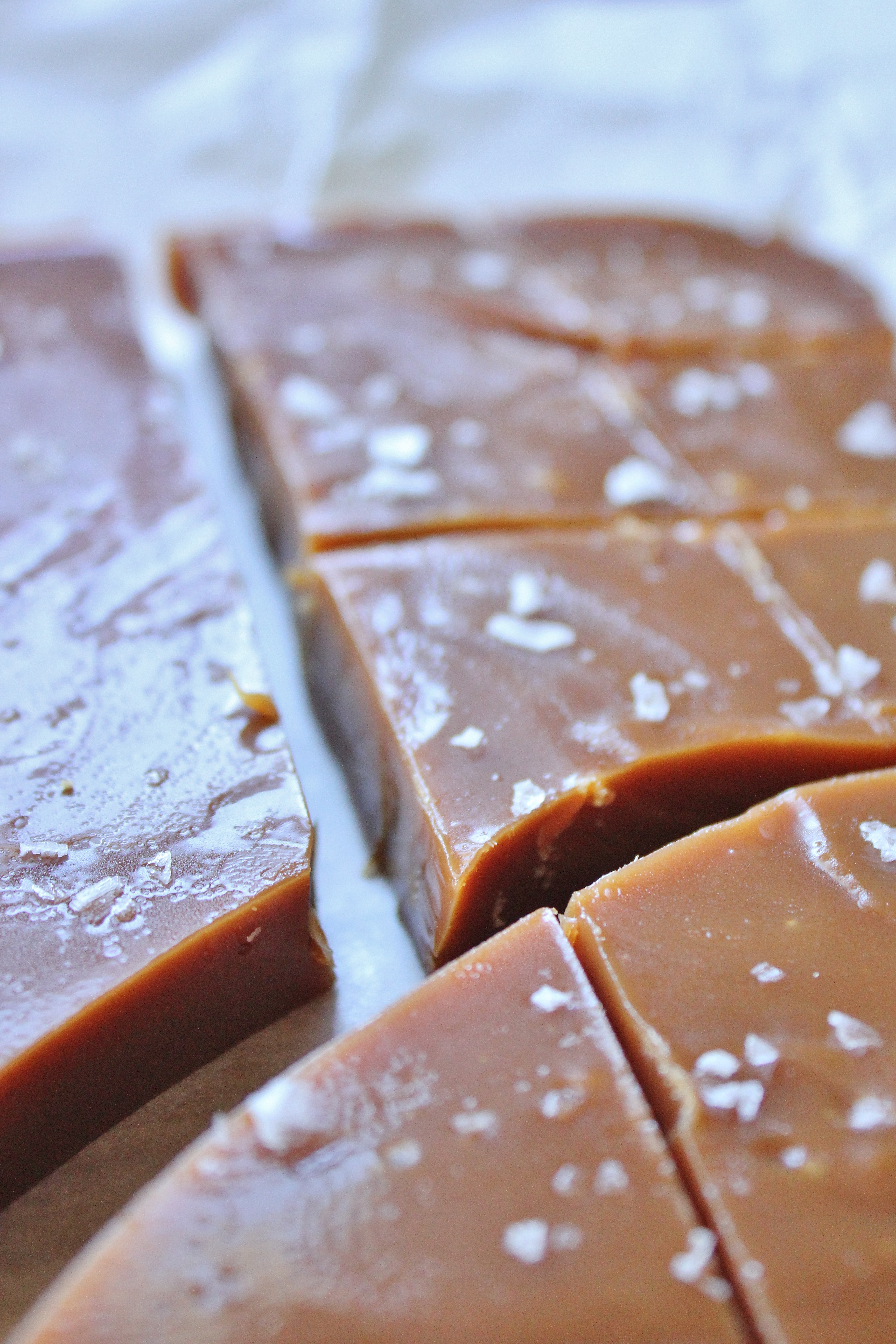 Remove from the freezer about ten minutes before cutting. When it comes to cutting, lightly oil a knife so that it glides through the caramel more easily when you’re cutting. Personally, I like to allow the caramel to shatter slightly – when cutting, put pressure on the tip of the knife while it’s in the caramel without pressing the rest of the blade down, this should cause little fractures in the caramel.